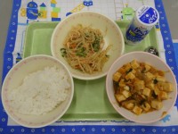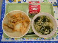 今日の給食は洋風揚げぎょうざとコーンシチュー