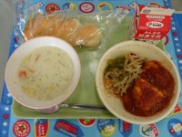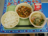 本日の献立は、「ご飯、牛乳、生揚げのオイスターソース炒め、ワンタンスープ」 炒め...