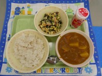 本日の献立は、「麦ご飯、ジョアストロベリー、チキンカレー、ひじきサラダ」 鶏肉、大きなじゃがいも、たまねぎなどが入った少し辛口なカレー。麦ご飯がどんどん進みます。ひじき、キャベツ、きゅうり、とろっとし...