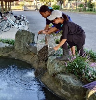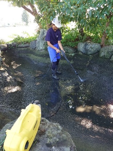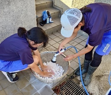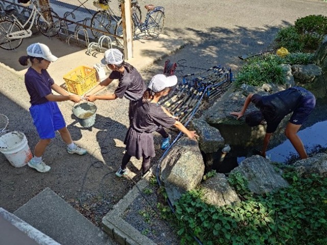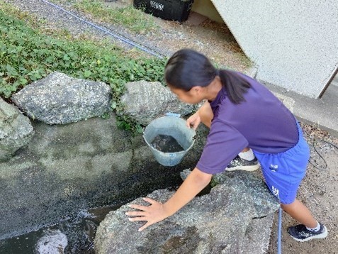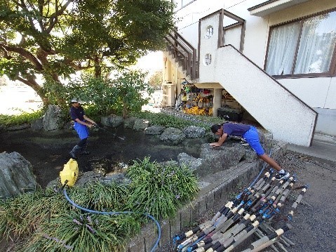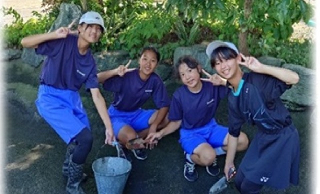 女子ソフトテニス部の有志4名の生徒と顧問の先生が、土曜日(9/25)に池の掃除をしてくれました。