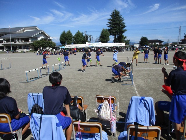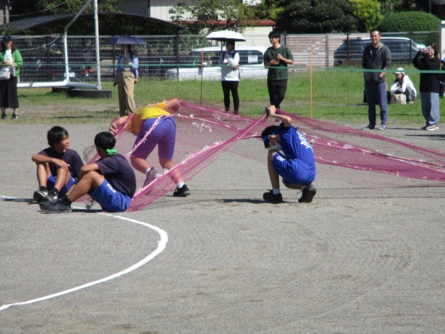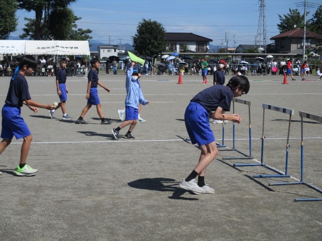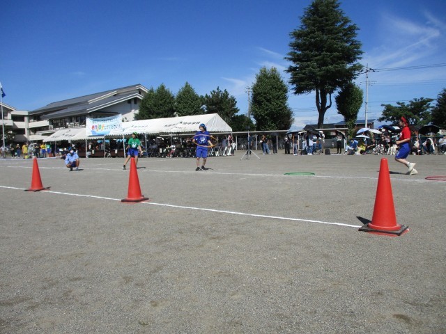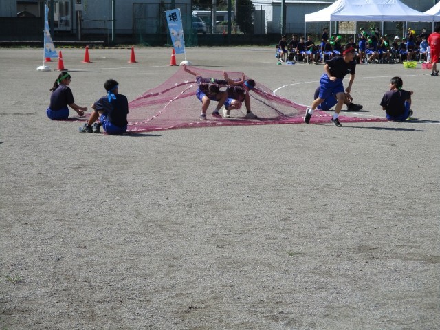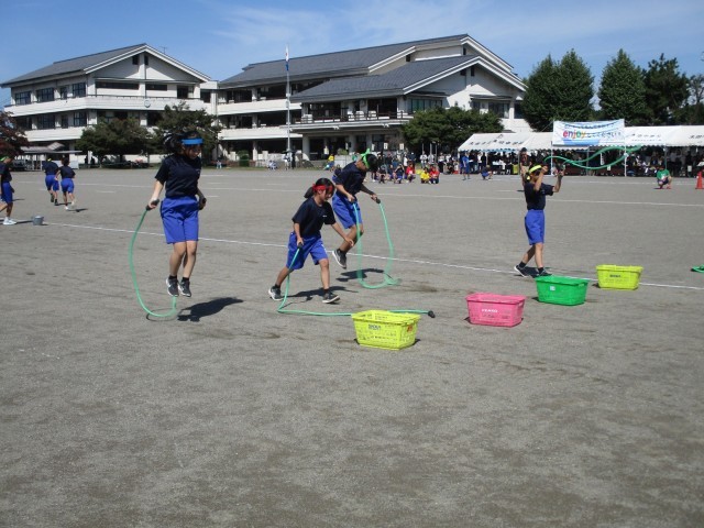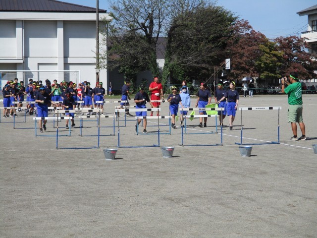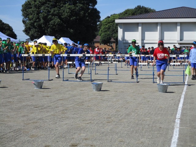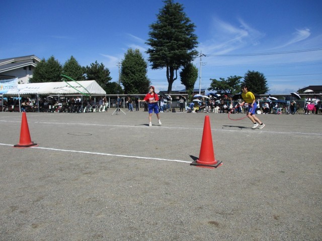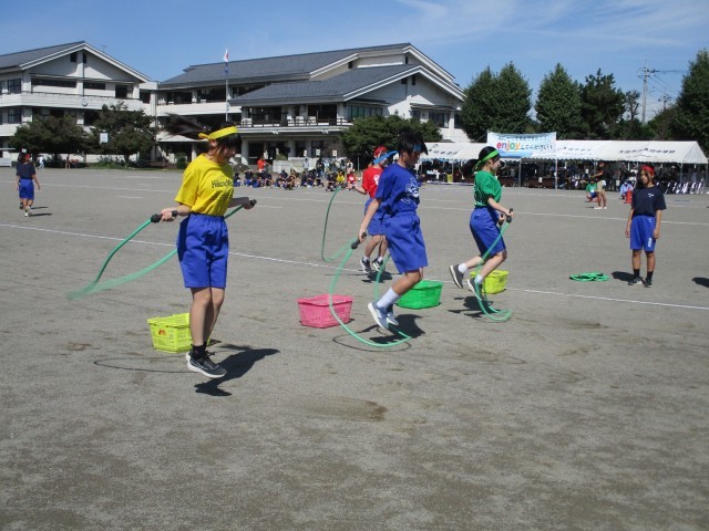 ①スプーンでボール運び(ハードルくぐり&またぎ) ②ヘビーロープ10回前跳び ③網くぐり ④フープ輪投げ
