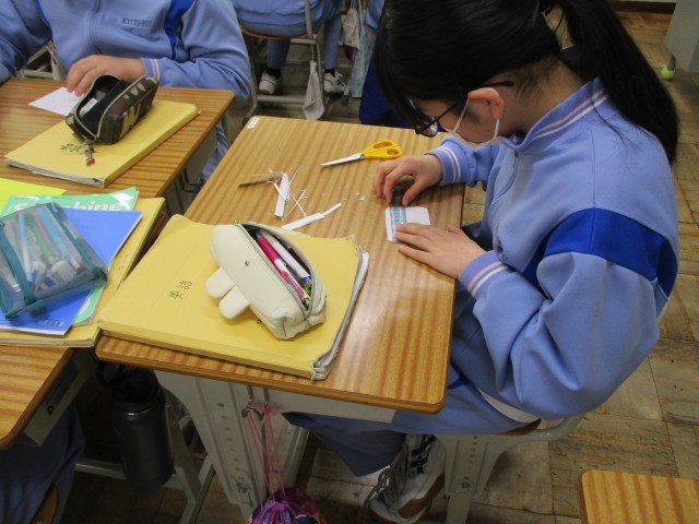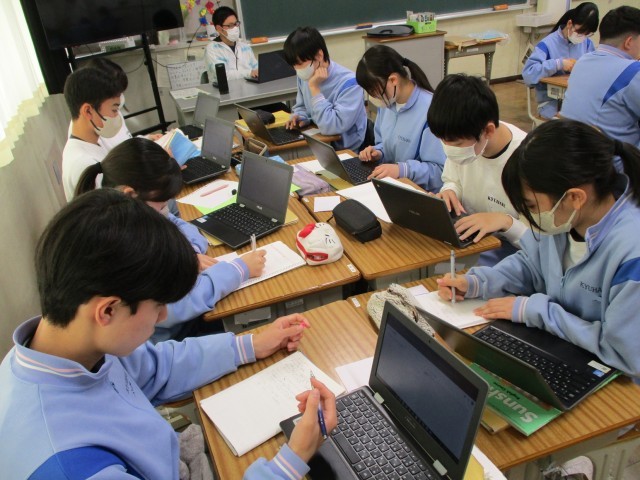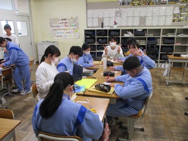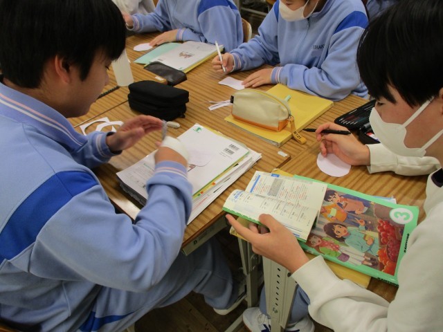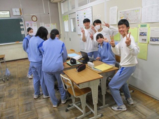 授業の様子(3年英語) 公開日 2026/02/27 更新日 2026/02/27 3年生 3年生の英語の授業で、これまでお世話になった先生方へ贈る「Thank you message」の作成に取り組んでいました。単に知っている英単語を並べるだけでなく、「どうすればより深く感謝が伝わるか」を追求するのが今回のポイントのようです。班ごとに「この表現の方が、先生への感謝が伝わるんじゃない?」と意見を出し合い、辞書や端末なども駆使しながら表現を磨き上げていました。 +4