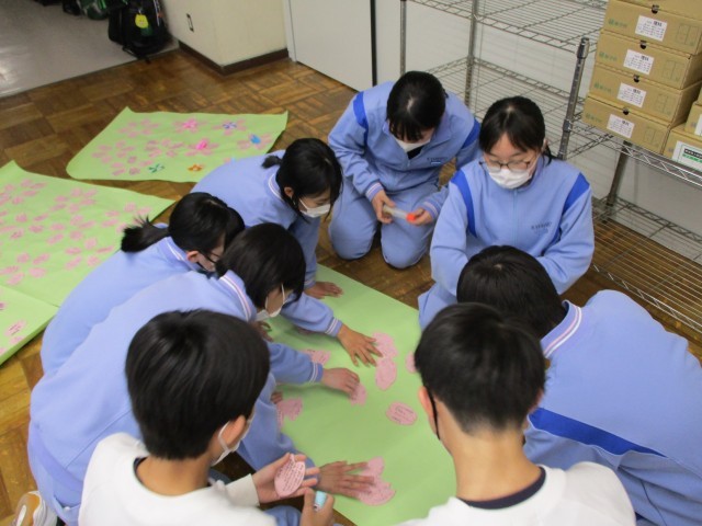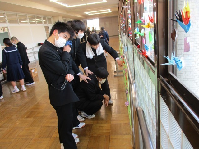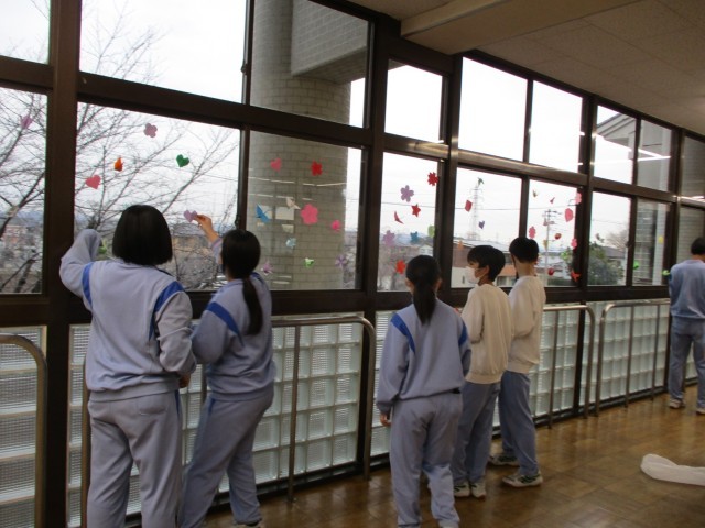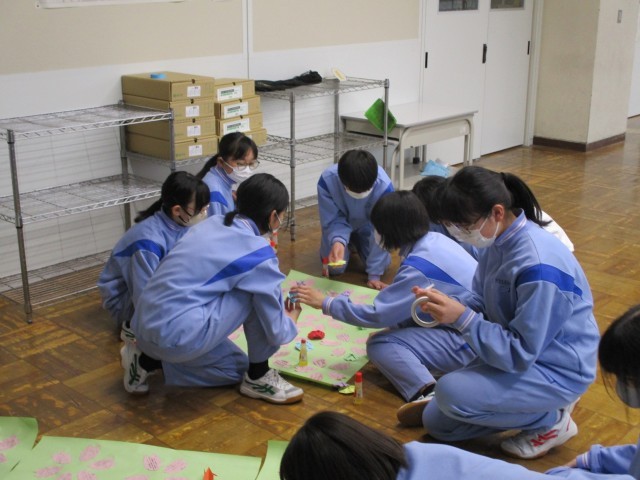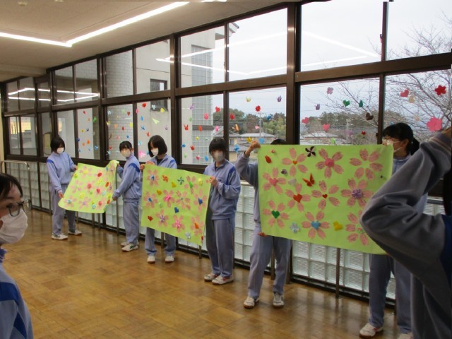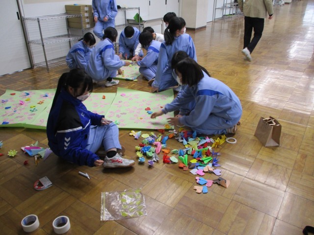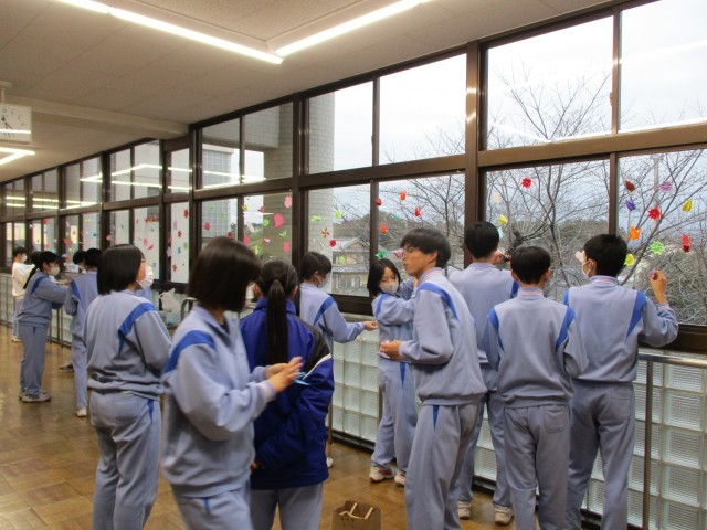 先週金曜日(3/6)の放課後、生徒会本部と1・2年生の学級代表が集まり、3年生へのメッセージを飾り付けました。