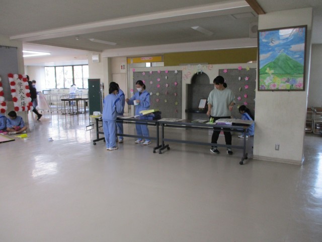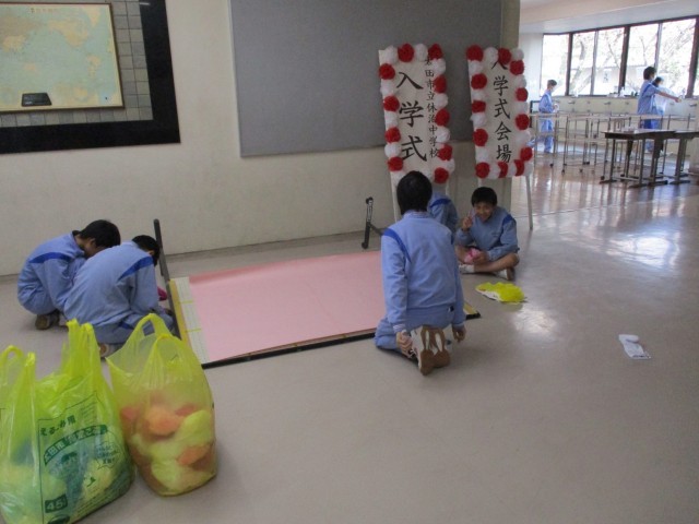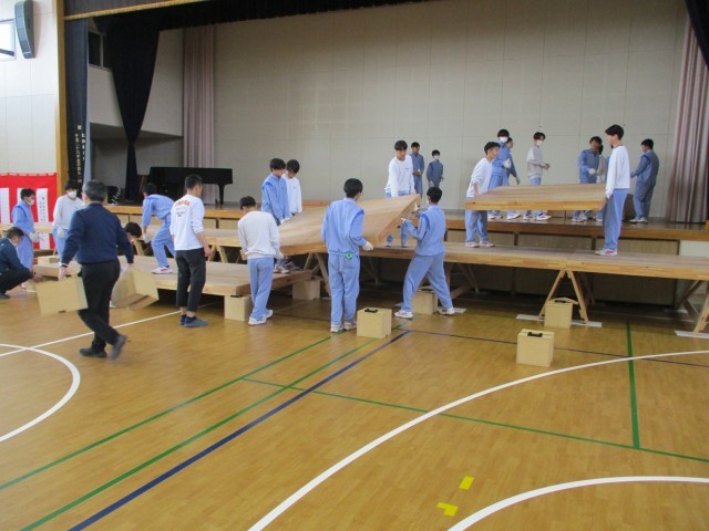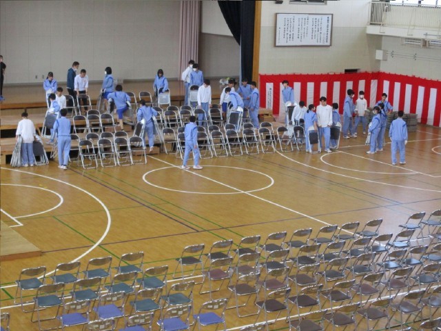 入学式準備の様子 公開日 2026/04/06 更新日 2026/04/06 学校のようす いよいよ令和8年度が始まりました。本日は、明日に控えた入学式の準備のため、新2・3年生が会場設営や校内清掃にあたりました。久しぶりに生徒たちの元気な声が響き、校舎に活気が戻っています。新入生を温かく迎える準備が整いました。教職員一同、明日、新入生の皆さんに会えるのを心待ちにしています。 +7