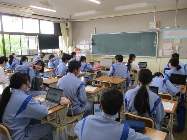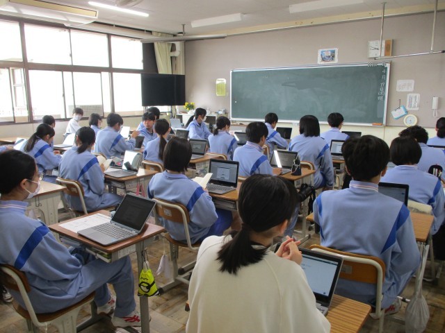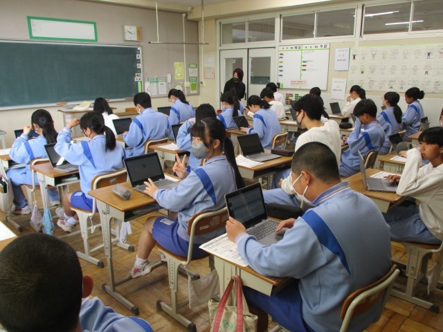 今回は「英語(読む・書く・聞く)」の3技能と、学習習慣などに関する「生徒質問紙調査」の実施です。タブレット端末を活用した調査ということもあり、ログイン時に少し苦戦する場面も見られましたが、担任等のサポートにより、最終的には全員が無事に調査を終えることができました。