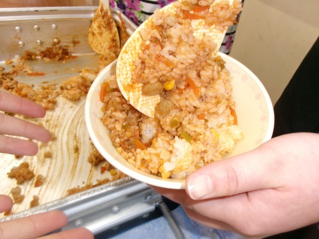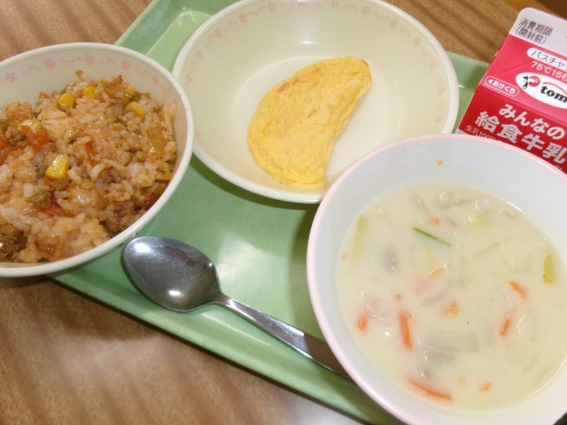 ジャンバラヤ、オムレツ、かぶのチャウダー、牛乳です。