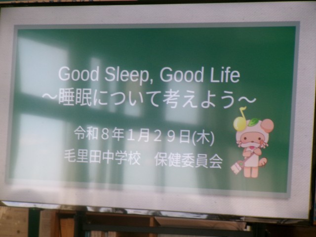 「今年の干支は、『午』です。毛里田中の校歌にある ♪ 強く気高く励めよと~ ♪ という歌詞は、馬をイメージできるものです。毛里田中のプライドをもち、強く、前向きにがんばる年にしてほしいと思います。(中略)3学期は、卒業や進級を控えた節目の学期です。卒業後や進級後の自分の姿を想像した行動をしてください。将来の自分は、今の自分が作ります。」