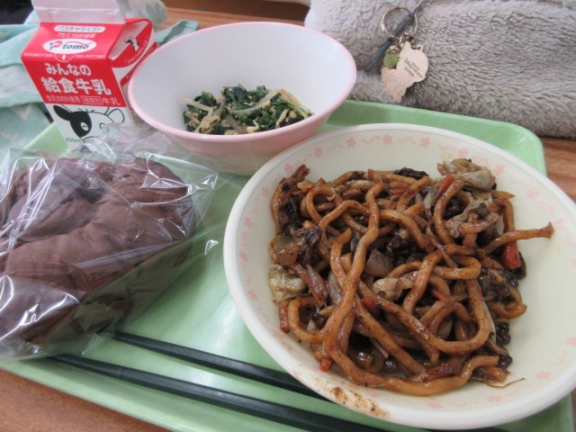 黒焼きそば、もやしのナムル、ココアパン、牛乳