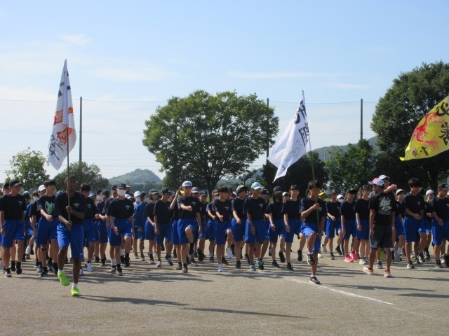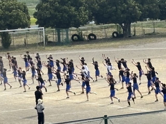 2年生の最初の授業は、保健体育(体育祭の練習)で元気よく行進練習です。体育祭が楽しみになるような元気な行進です。