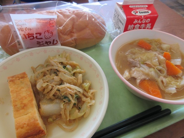 給食は、チキンだっす、こんにゃくのピリ辛炒め、キャベツの味噌汁、牛乳、ご飯です。