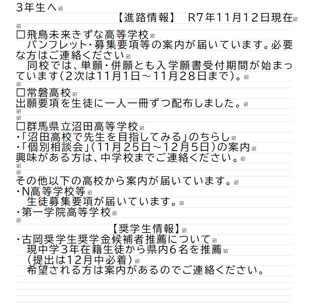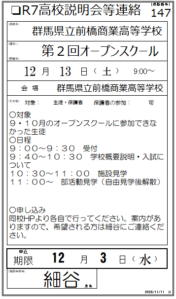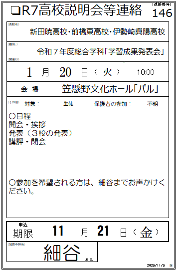 (1)新田暁高校・前橋東高校・伊勢崎興陽高校の総合学科「学習成果発表会」、(2)飛鳥未来きずな高校などの高校等と古岡奨学生奨学金、(3)群馬県立前橋商業高等学校の案内です。