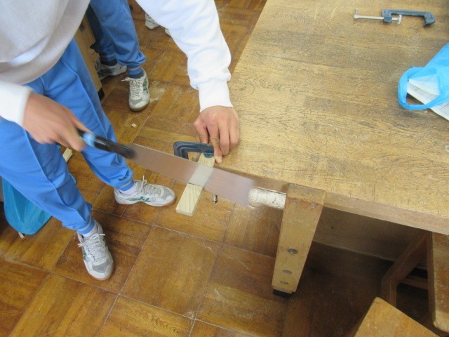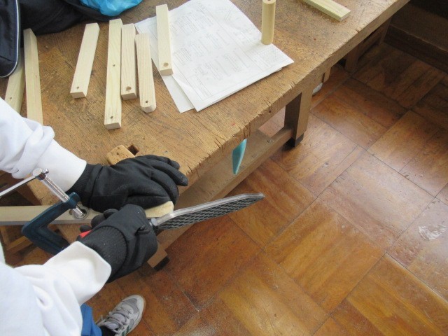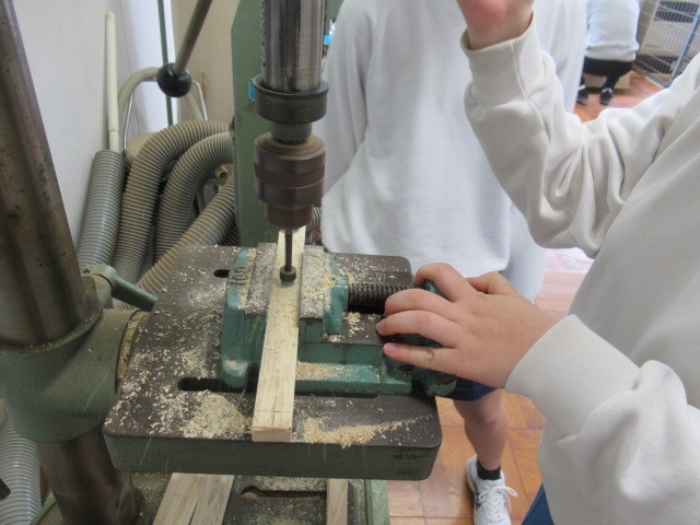のこぎりで切断したり、やすりで角を取ったり、卓上ボール盤を使って穴をあけたりと、それぞれが作業に取り組んでいました。