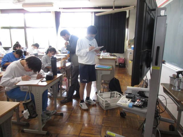 今日は、ヘッドホンを付けて、「聞く」「話す」「書く」調査の練習をしました。