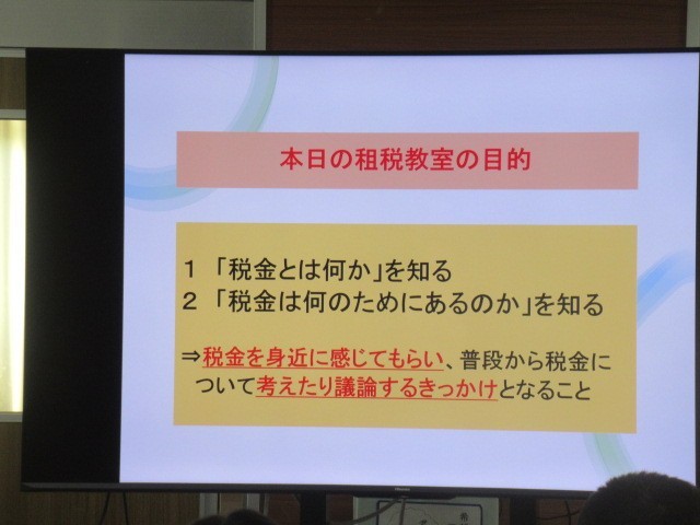 税務署の方を講師にお招きし、私たちが普段利用している公共サービスが税金によって支えられていることなどを解説して頂きました。