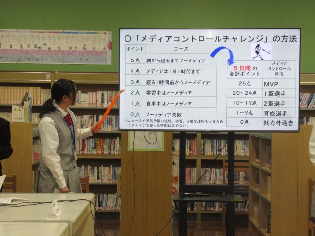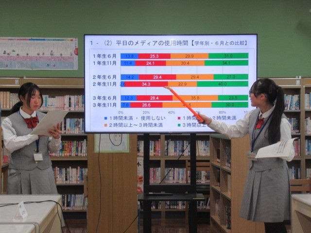 校医の先生やPTA本部の方々をお招きし、2年生の保健委員がメディアコントロールチャレンジや健康生活リズムチェックの結果、カビパンを用いた手の汚れについての調査などについて発表しました。