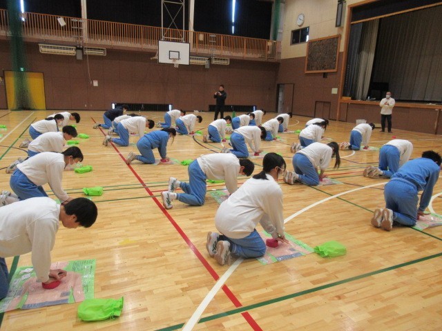 PUSH講習実施! 公開日 2026/02/02 更新日 2026/02/02 2年生 本日、2年生がPUSH講習を行いました。これは、胸骨圧迫(心臓マッサージ)とAEDの使い方を学ぶ心肺蘇生法講習です。講師に救急救命士をお呼びしてクラスごとに実施します。みんな実際に胸骨圧迫をキットを使って実践するなど、もしもの時に対応できるよう学んでいます。 +3
