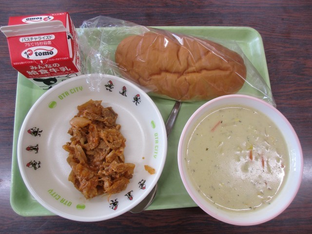 今日の給食はBBQポーク 公開日 2026/04/14 更新日 2026/04/14 お知らせ 今日の献立は、バーベキューポーク・野菜たっぷりポタージュ・ミルクパン・牛乳でした。バーベキューポークは食欲の増す味付けでした。ポタージュはザラッとした食感で、とてもおいしかったですね。今日も完食です。ごちそうさまでした!