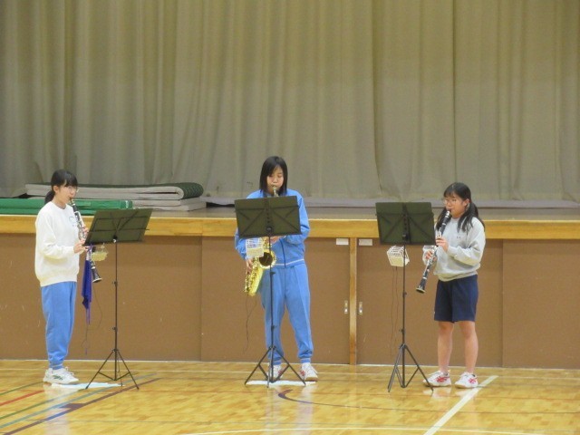 11月23日(日)に行われる群馬県東部地区アンサンブルコンテストに出場予定の生徒による木管三重奏の演奏を、昼休みに体育館で披露しました。