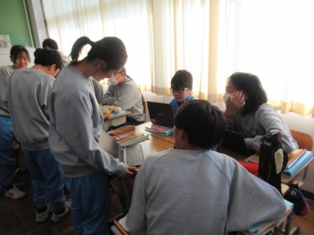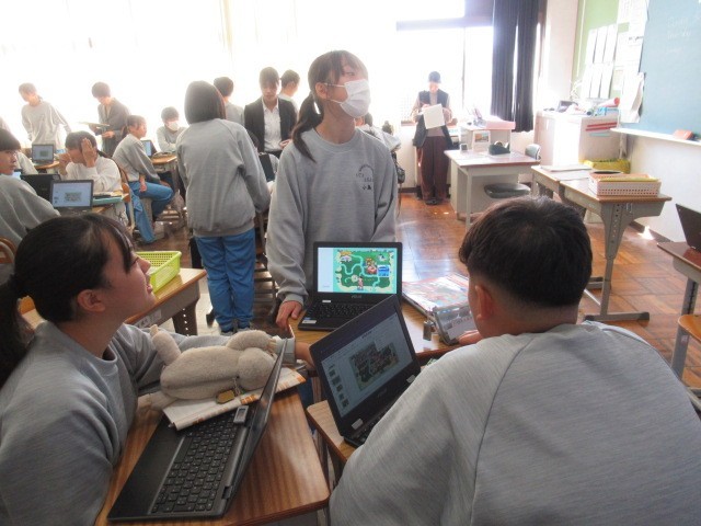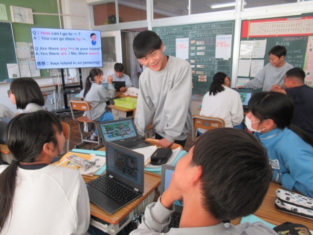 生徒らはグループになり、1人1台端末を使って作成した、「自分の島」について、英語で発表しています。