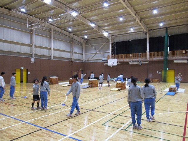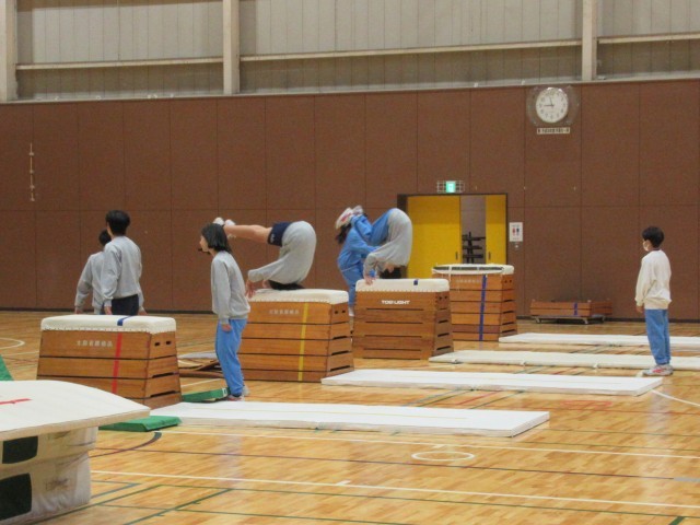 技がきれいに見えるためのポイントをみんなで確認しながら、開脚跳びや台上前転に何度もチャレンジしています。