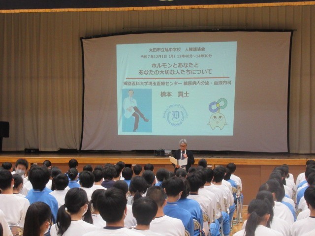 初日は、5時間目に体育館で獨協医科大学埼玉医療センターの橋本貢士医学博士を講師に迎え、人権講話を行いました。