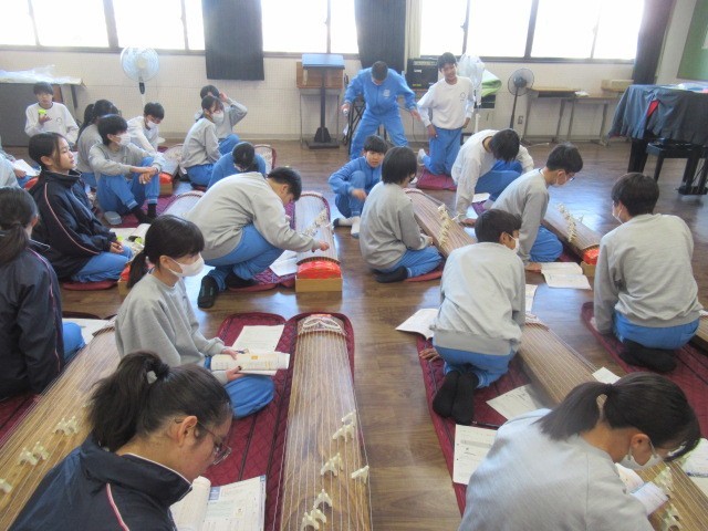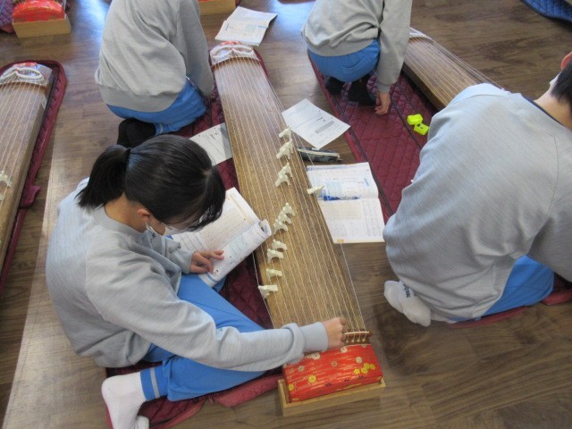 今日は1年生の音楽の授業で、和楽器・琴に挑戦しています。