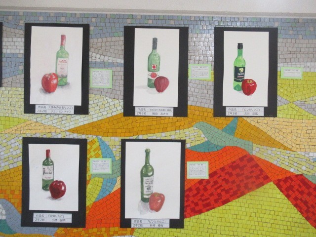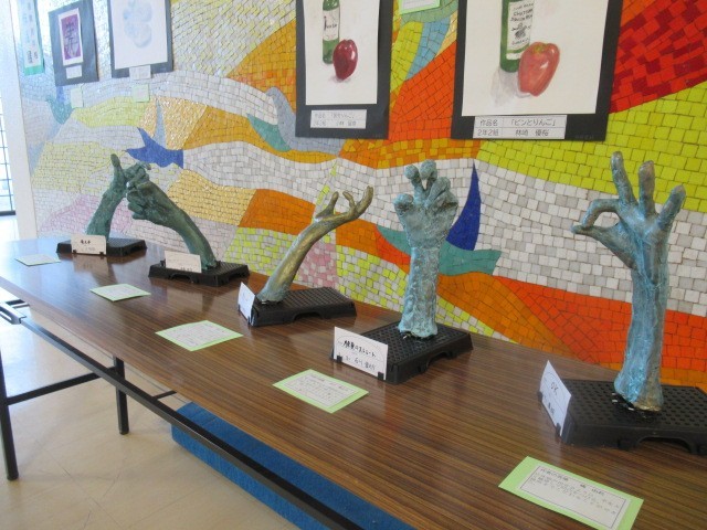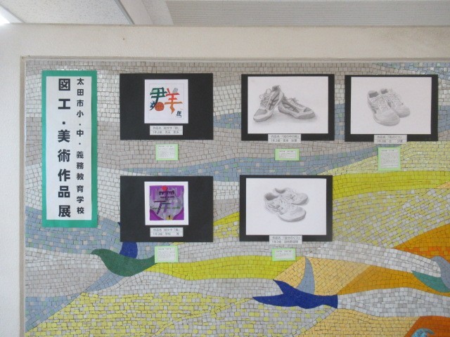 太田市図工・美術作品展の代表作等を1階生徒玄関脇に展示しています。