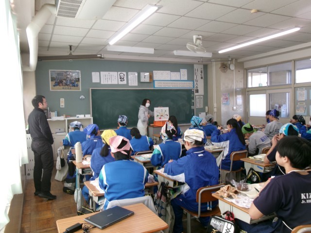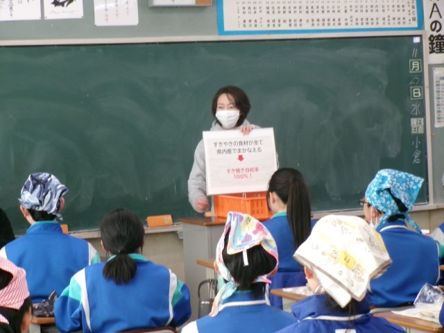 給食の時間に栄養教諭の飯島先生から、お話がありました。群馬県では、11月29日を「いいにくの日」にちなんで、「ぐんま・すき焼きの日」としています。すき焼きは、全ての食材が群馬県産でまかなえる料理です。群馬県ならではのおもてなし料理となるよう、県をあげてプロジェクトを立ち上げています。給食でも「すき焼き風煮」が27日に登場します。群馬県産の豚肉と野菜をたくさん使ったすき焼きになっています。地域の恵みに感謝していただきましょう。