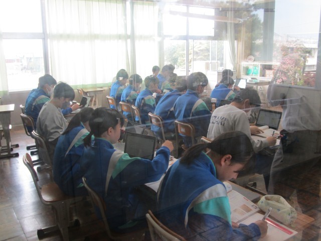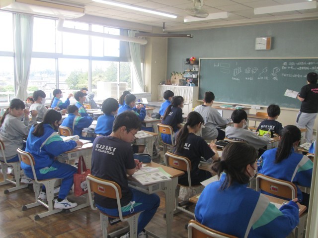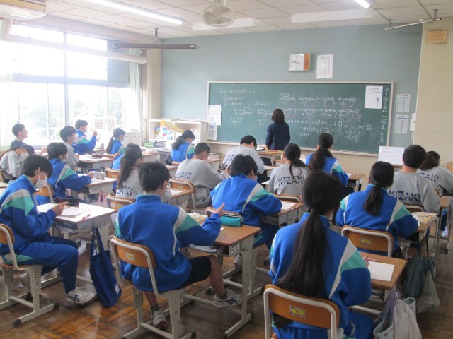 2年生の理科、2年生の社会、1年の技術、1年の数学の授業風景です。