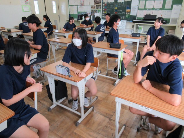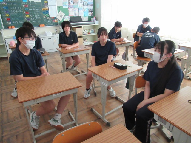 今回は、3つの場面を生徒会本部役員が、寸劇で全校生徒に伝え、それについてグループで話し合う形で行いました。