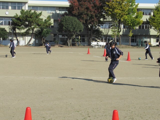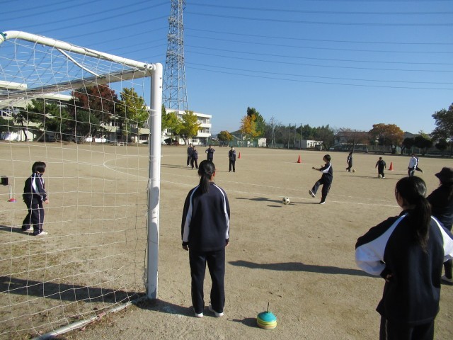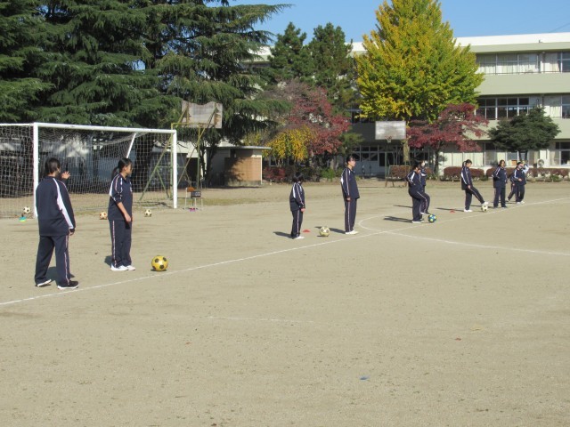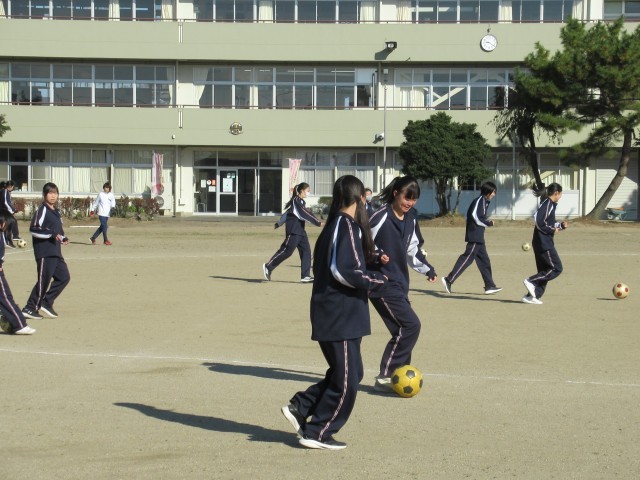校庭では3年生の女子体育の授業でサッカーに取り組む生徒の姿がありました。
