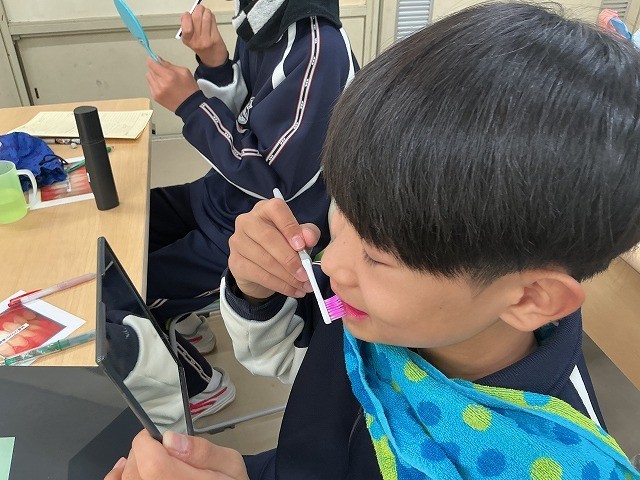 さらに、1回目(7/2)で学んだことを思い出し、自らのブラッシングの状態を各自確認しました。