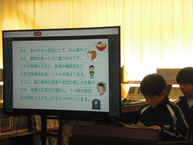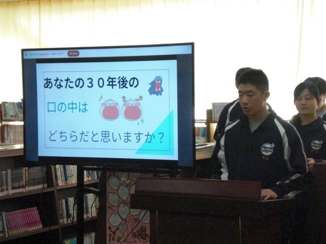 テーマ「治療から予防へ…定期的に歯科医院へ通おう!」について、保健委員会の発表や進行で、歯と口腔の健康維持の視点から本校の現状と対策、そして、クイズ形式で必要な知識について確認しました。