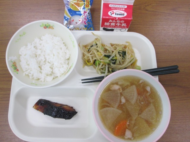 今日の献立は、サバの照り焼き・もやしと小松菜の和え物・里芋汁・お月見だんご・ご飯・牛乳でした。