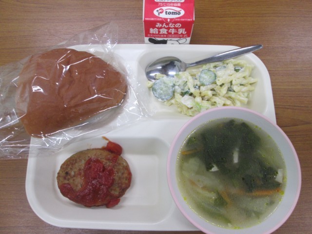 今日の献立は、ハンバーグトマトソースかけ・マカロニサラダ・コンソメスープ・パーカーハウス・牛乳でした。
