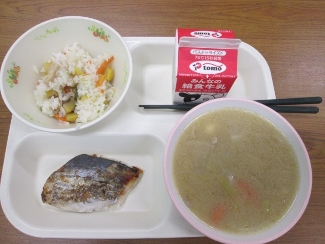 今日の献立は、栗ご飯・さわらの塩麹焼き・豚汁・牛乳でした。