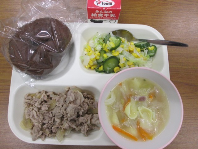 今日の献立は、豚肉の欧風煮込み・マカロニスープ・コーンサラダ・ココアパン・牛乳でした。