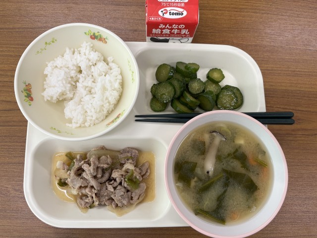 今日の献立は、豚肉のバーベキューソース・ピリ辛きゅうり・秋野菜の味噌汁・ご飯・牛乳でした。