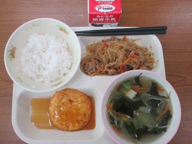 月曜日の献立は、チャプチェ・わかめスープ・かに玉甘酢あんかけ・ご飯・牛乳でした。