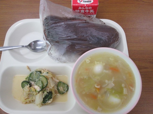 今日の献立は、ココア揚げパン・ABCスープ・白菜とチキンのサラダ・牛乳でした。