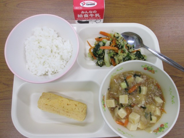 今日の献立は、麻婆豆腐・厚焼き卵・ナムル・ご飯・牛乳でした。