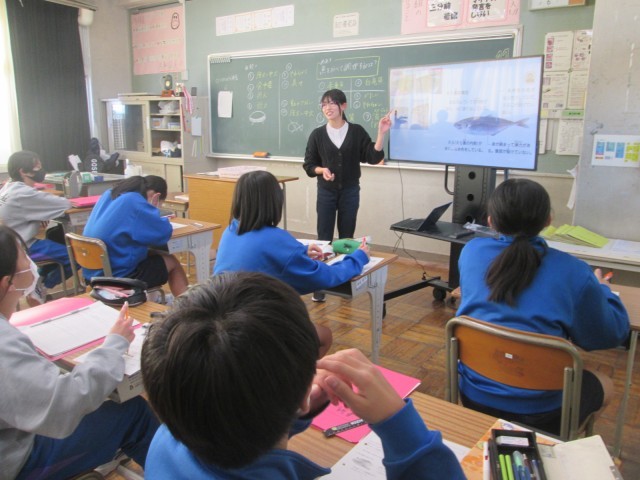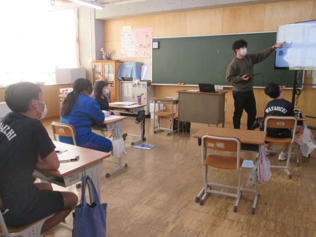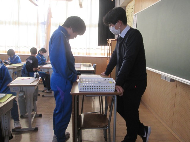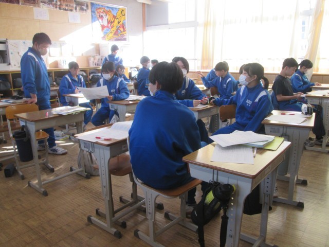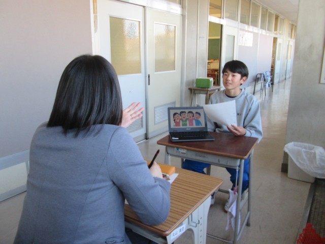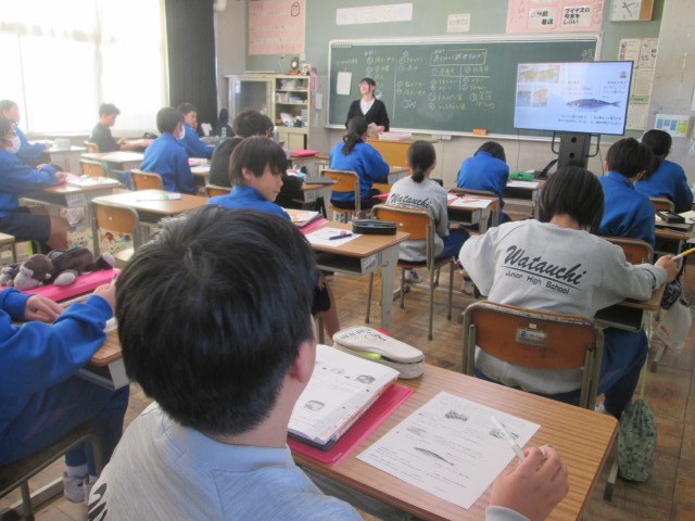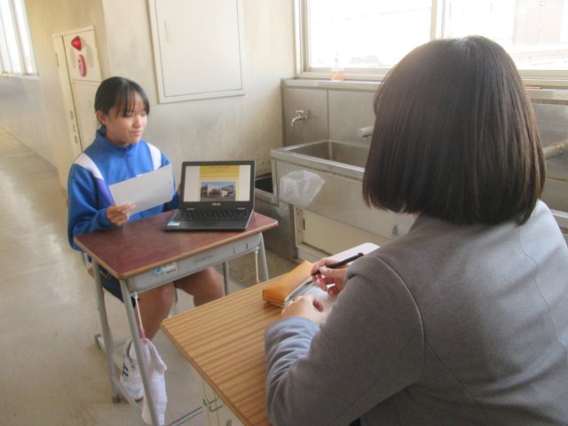 英語では、綿打中の先生について、英語で紹介するテストをしていました。