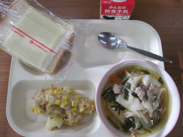 今日の献立は、ワンタンスープ・ツナポテト・スライスチーズ・食パン・牛乳でした。
