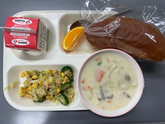 今日の給食はエビとマカロニのクリーム煮、ツナサラダ、オレンジ、ミルクパン、牛乳です。