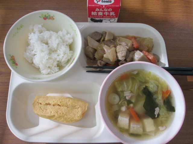 今日の献立は、厚焼きたまご・大根と里芋のみそ煮・吉野汁・ご飯・牛乳でした。