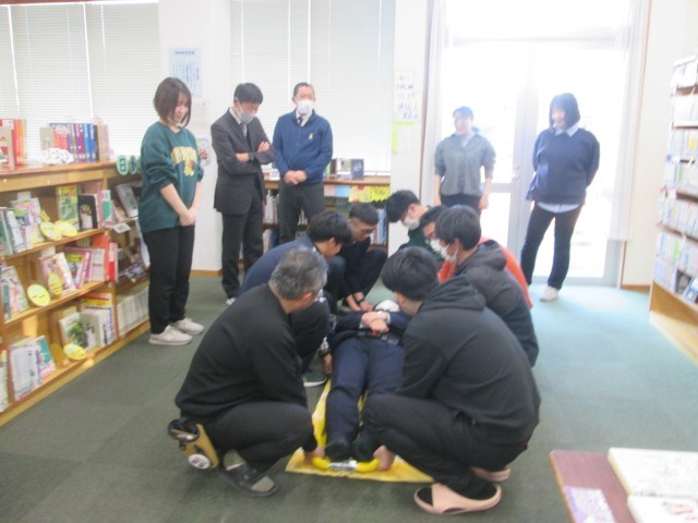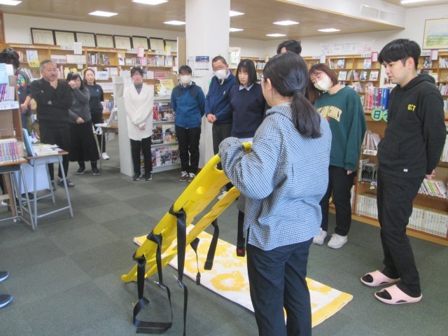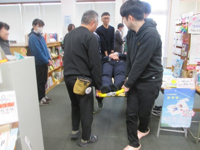 いざというときに備えて、けが人や病人をどのようにして運んだらよいのか、体験的に学びました。