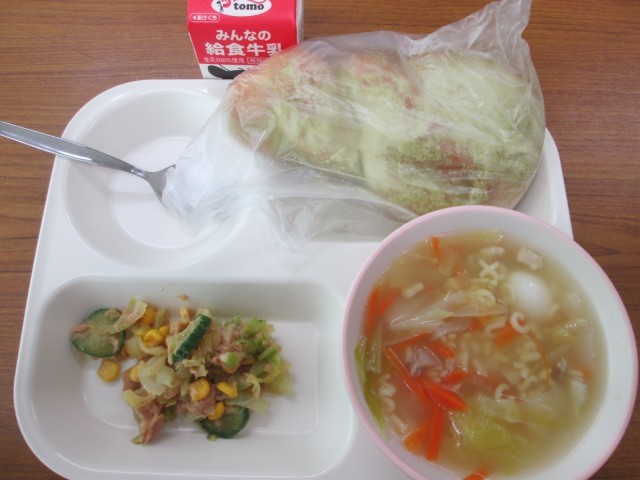 今日の献立は、うぐいす揚げパン・ABCスープ・ツナサラダ・牛乳でした。