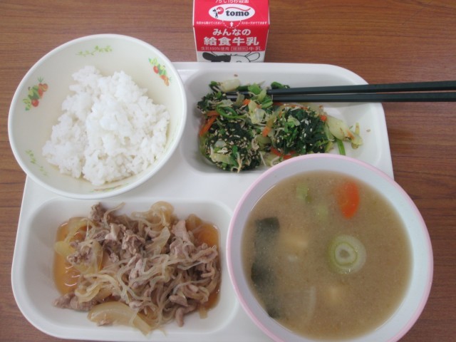 今日の献立は、豚丼の具・じゃこと野菜の和え物・なめこの味噌汁・ご飯・牛乳でした。