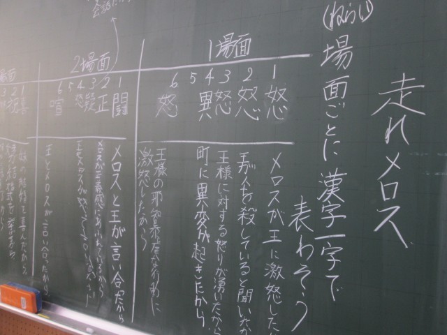 国語では、走れメロスを読んだ後、場面ごとに漢字一文字で表し、その理由を書いていました。