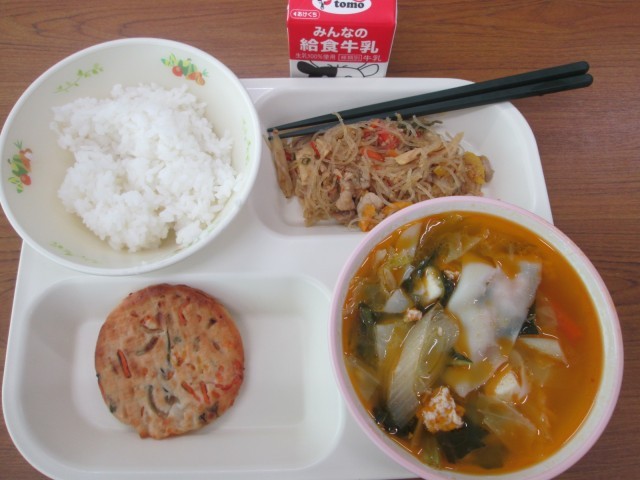今日の給食は韓国風 公開日 2026/02/02 更新日 2026/02/02 お知らせ 今日の献立は、ちぢみ・チャプチェ・タンタンスープ・ご飯・牛乳でした。韓国料理のレストランに来たようなメニューで、おいしくいただきました。ピリ辛の味付けで、食欲が増しました。インフルエンザB型が流行しています。しっかり食べて、元気に頑張りましょう。